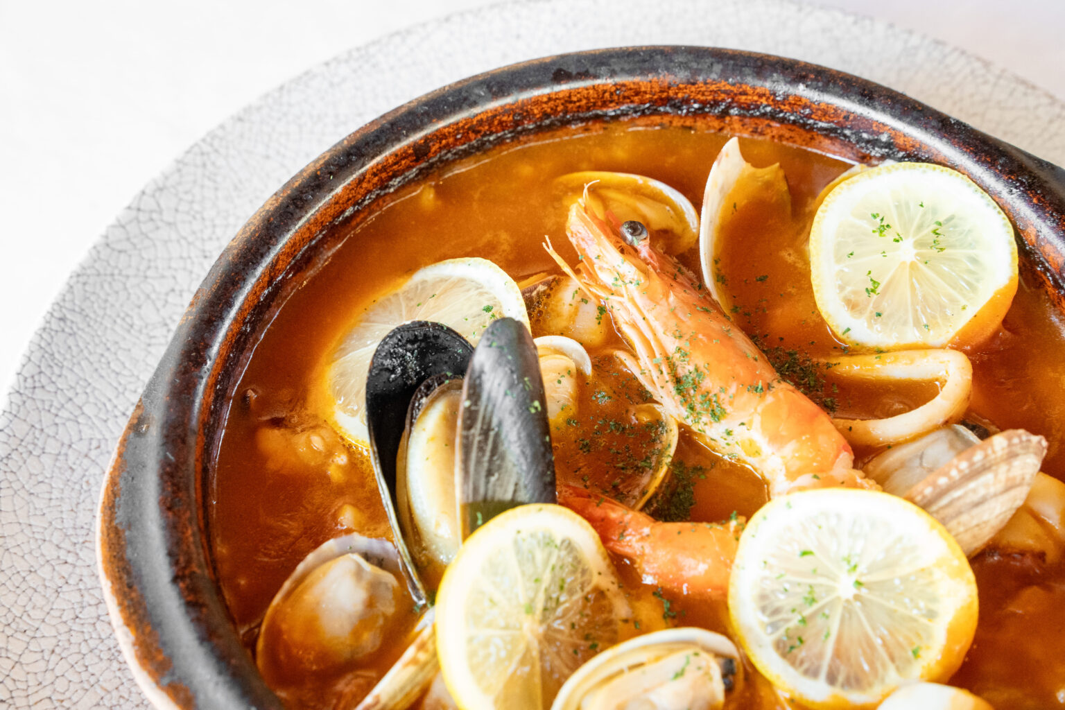 エビ、ムール貝、アサリなどの魚介の出汁が溶け込んだ濃厚なスープに、トマトの酸味と旨味が重なり、深いコクのある味わいに仕上げました。