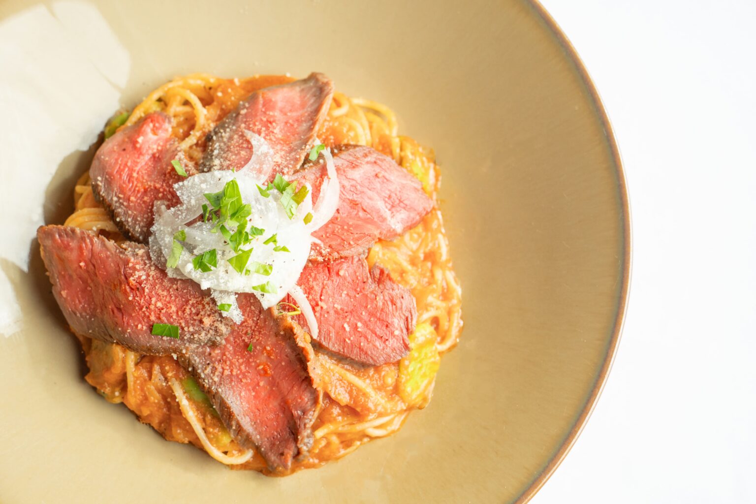 旨味を閉じ込めるようにじっくり熟成させた国産牛ローストビーフを豪快にトッピングした、ゴールデンウィーク限定パスタ。