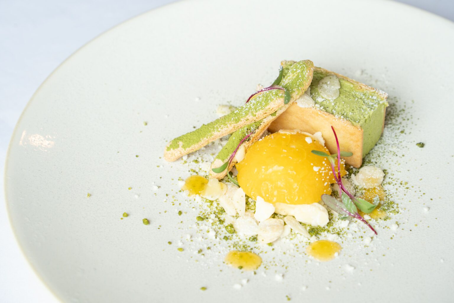 ・抹茶レアチーズのバターサンド~パッションフルーツのジュレをまとったヨーグルトアイス添え~