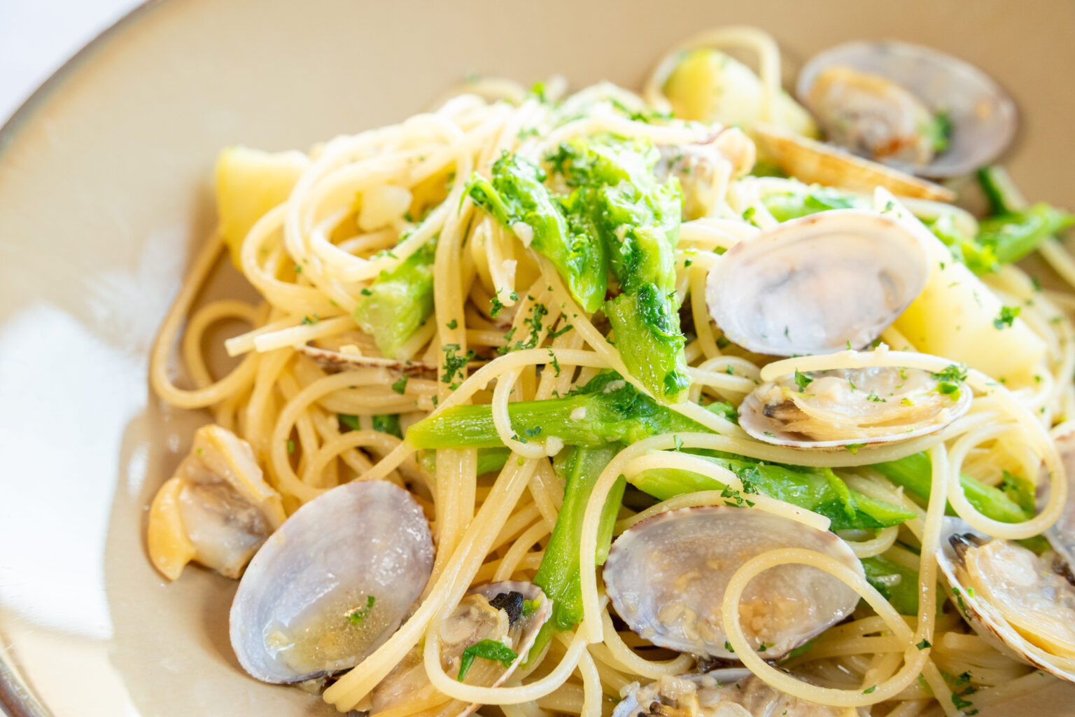 菜の花と新じゃが芋のボンゴレジャッロ
