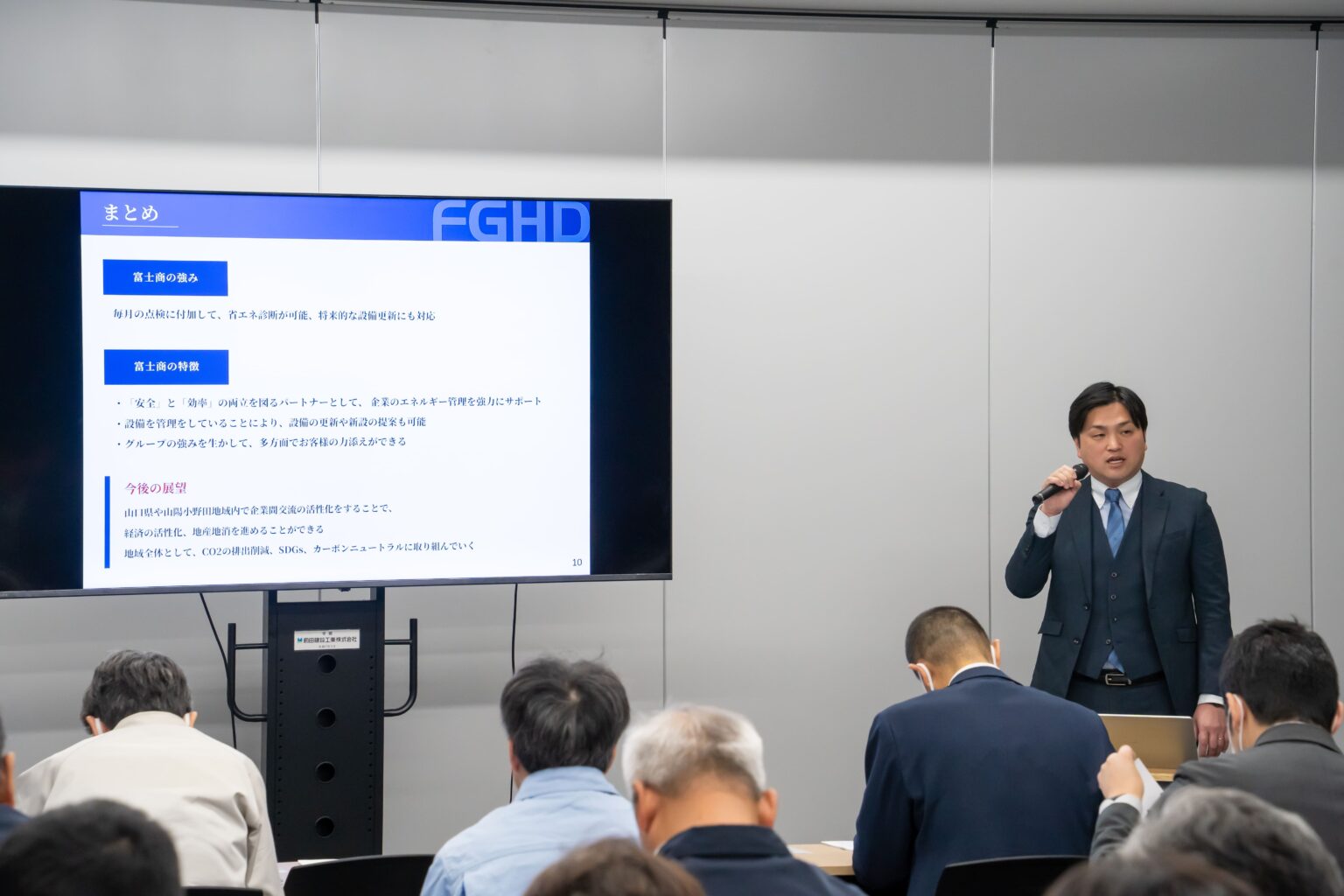 富士商株式会社(本社:山口県山陽小野田市 代表取締役:藤田 敏彦)は、令和8年(2026年)1月23日(金)に西京銀行(本店営業部:山口県周南市 代表取締役頭取 :松岡 健)との共同開催で「企業のための省エネ戦略セミナー」を実施いたしました。